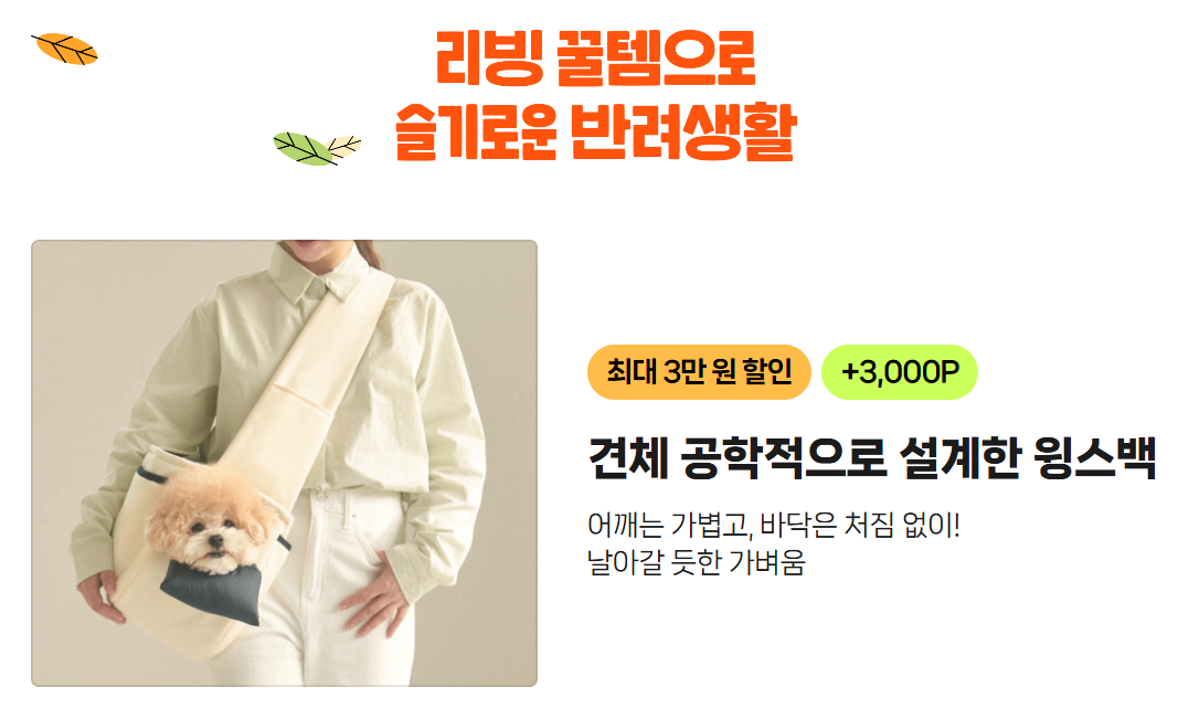 - ✅ 한 아이템만 구매하기보다는 관련 용품을 묶음으로 구매해서 할인+적립을 최대한 활용해 보세요. 예: 관절영양제 + 슬링백 + 산책용 간식 등