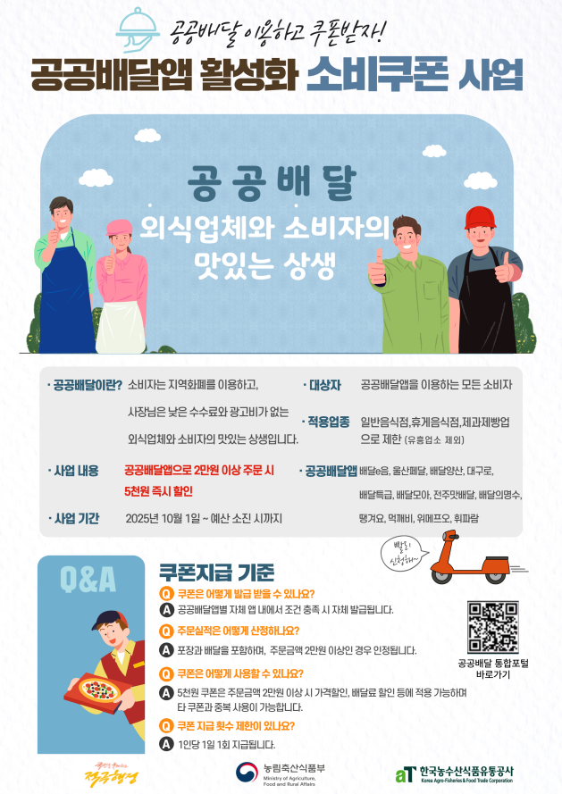 농림축산식품부에 따르면, 10월 1일부터 공공배달앱에서 2만 원 이상 주문하면 매일 5천 원씩 할인을 받을 수 있어요.