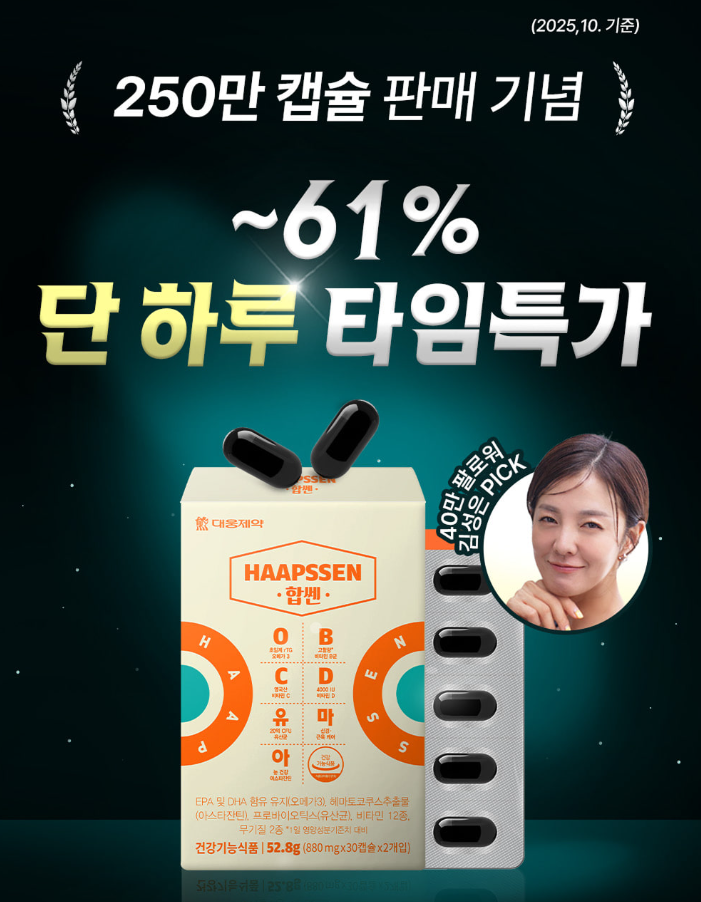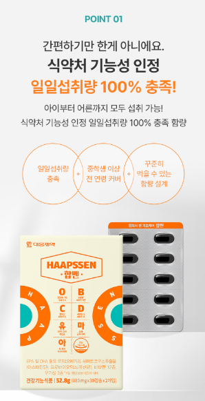 하루 2알로 오메가3, 비타민, 유산균까지 한 번에 챙길 수 있는 멀티 영양제, 대웅제약 합쎈(HAAPSSEN)을 소개합니다.