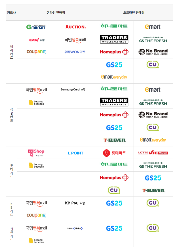 | 카드사 | 온라인 쇼핑몰 | 오프라인 매장 |