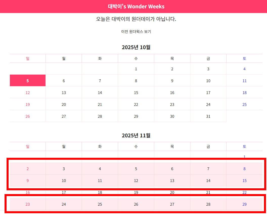 3. 빨간 박스를 누르면 주차별 아기의 원더윅스 증상을 확인하실 수 있어요.