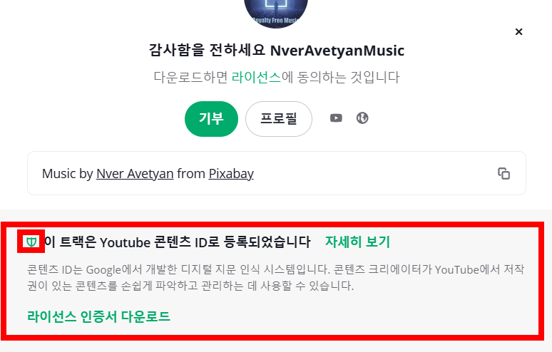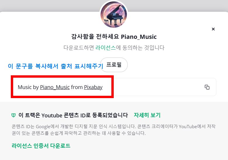 - 유튜브 스튜디오에서 클레임 발생 시 “라이선스 있음” → 픽사베이 링크 첨부