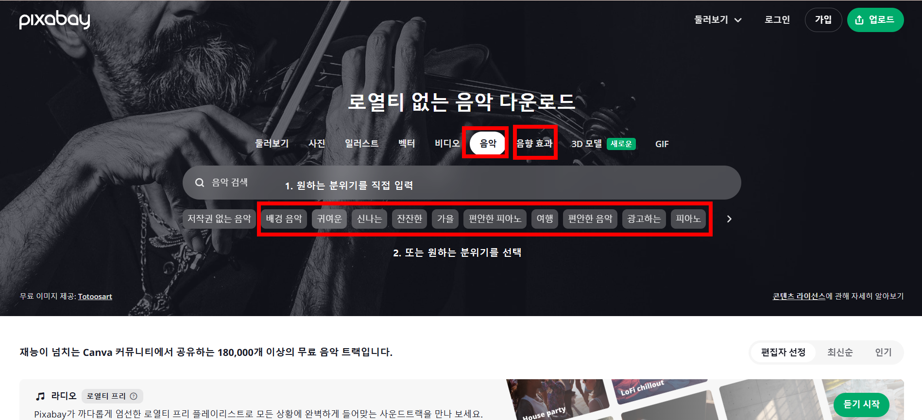 - 픽사베이는 회원가입 없이도 무료 음악·효과음 다운로드 가능
