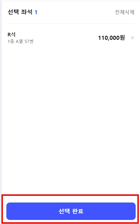 금액과 좌석 종류, 좌석 번호를 확인 후 선택완료를 눌러주세요.