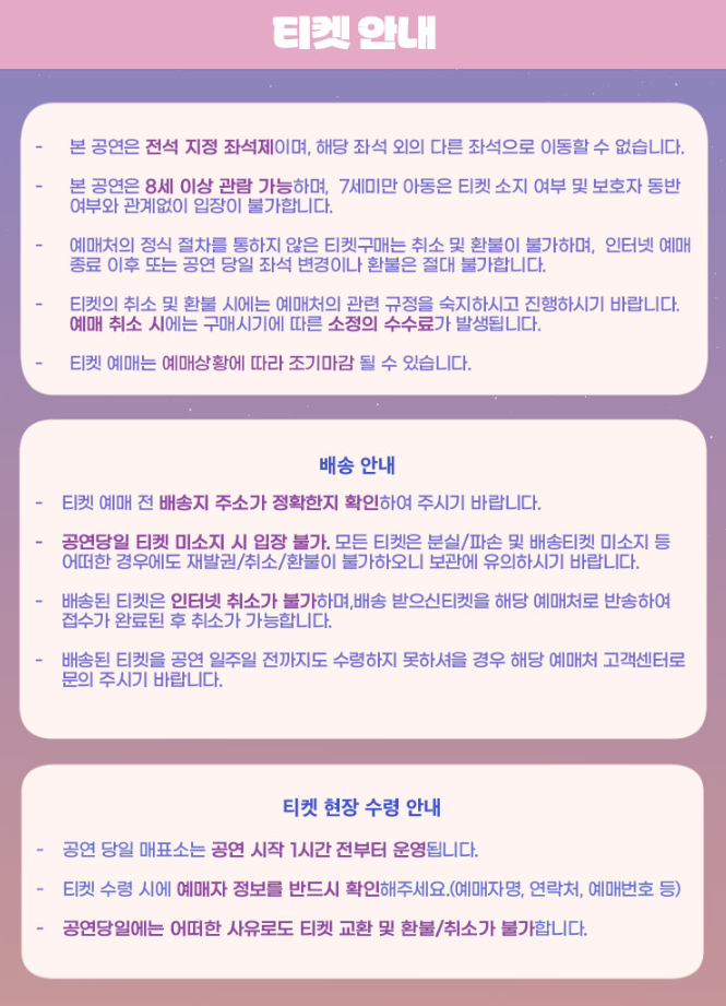 ※ 공연 당일 현장 구매는 좌석이 남은 경우에만 가능하며, 할인 혜택 적용이 어렵습니다.
